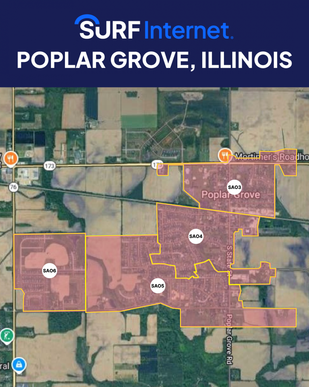 Surf Internet is bringing high-speed, fiber-optic internet to the village of Poplar Grove. Construction is estimated to start on 04/20/26 in Serving Area 03 (SA03). Serving areas will be built and completed in the following order: SA03, SA04, SA05, SA06.
